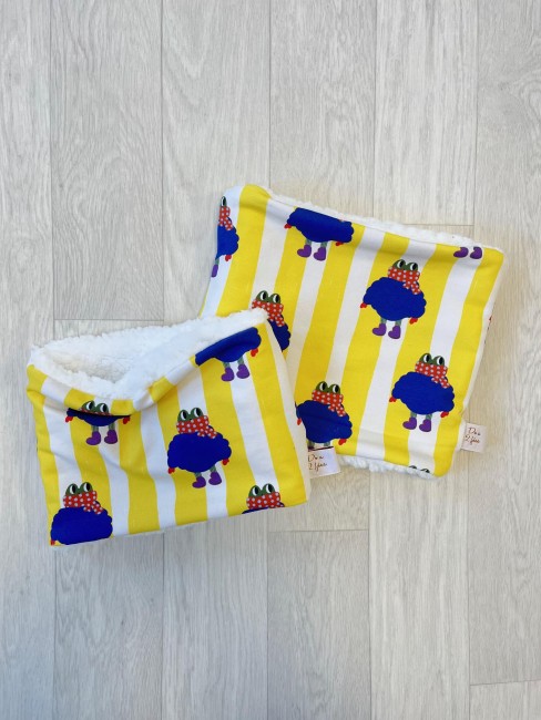 Avec sa grenouille emmitouflée, bonnet, doudoune et bonne humeur, c'est LE snood qui transforme les matins frais en moments cocooning.